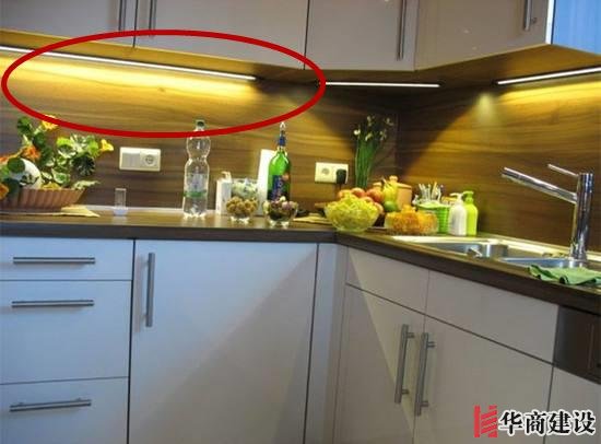 22、廚房不要隻裝吸頂燈,晚上做飯身體會擋住光源,最好在吊櫃下面裝一個觸碰光源,增加照明。