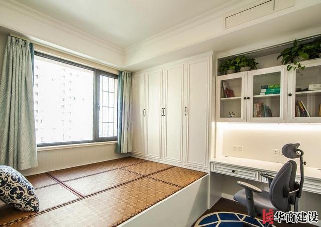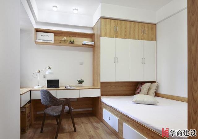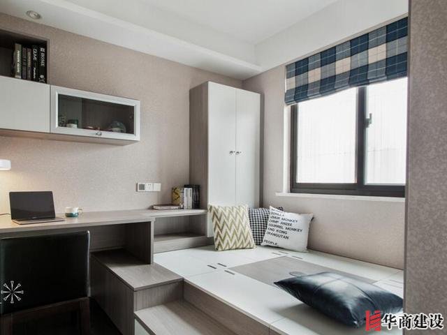 可以根據房間大小定制一個榻榻米+吊櫃+書桌的設計,一間房不僅可以休息,而且還能當做書房使用,上下打出的櫃子。留下瞭更多的儲物空間,就連反季的衣物都有地方收納瞭!