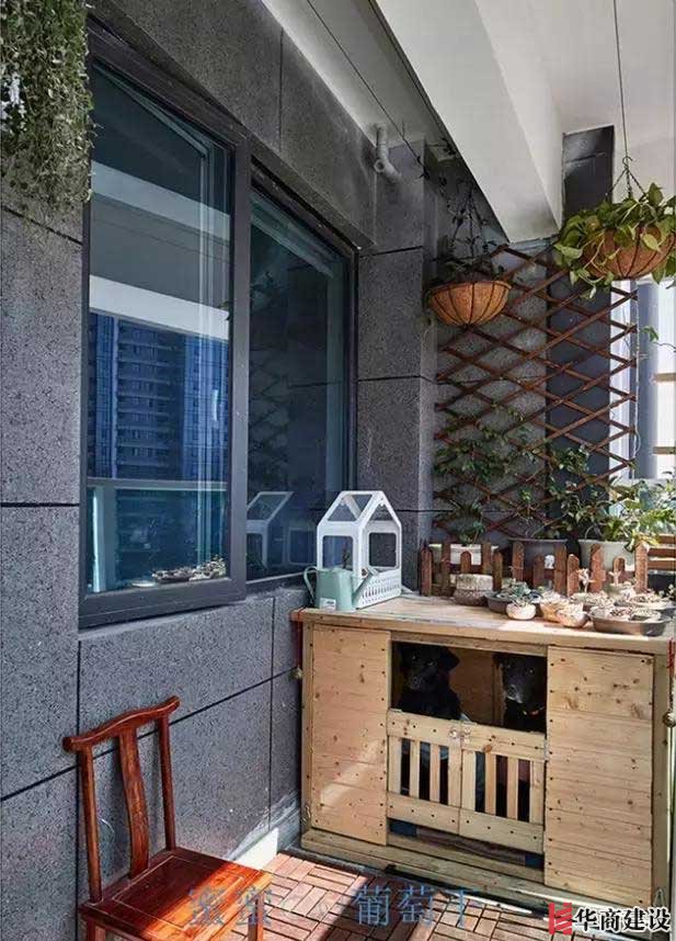 第三種:花架+休閑卡座成就大陽台。實際生活中,好多人都有這個借口,陽台都晾衣服瞭,哪有空間養花休閑?其實休閑不是物質擺放,而是一種心情。比如住大别墅,沒有那個情調,别墅也能住成豬窩;住小戶型,隻要有對生活的熱情,也能住出世外桃源的味道。生活陽台晾衣服,並不妨礙做休閑設計,角落防腐木休閑卡座,搭配小型休閑桌,幾把休閑椅搭配,平時喝茶閑坐的好地方,剩餘地方局部花盆花架點綴,生活和休閑兩不誤。