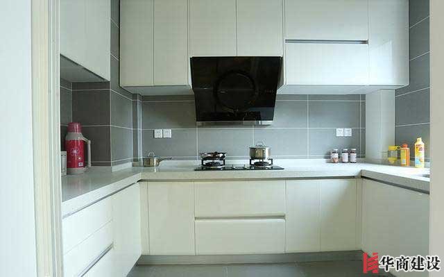 廚房是灰白配色,U字型的整體櫥櫃搭配灰色的牆磚和地磚,這其實也就是北歐風格的一種代表性色調瞭。